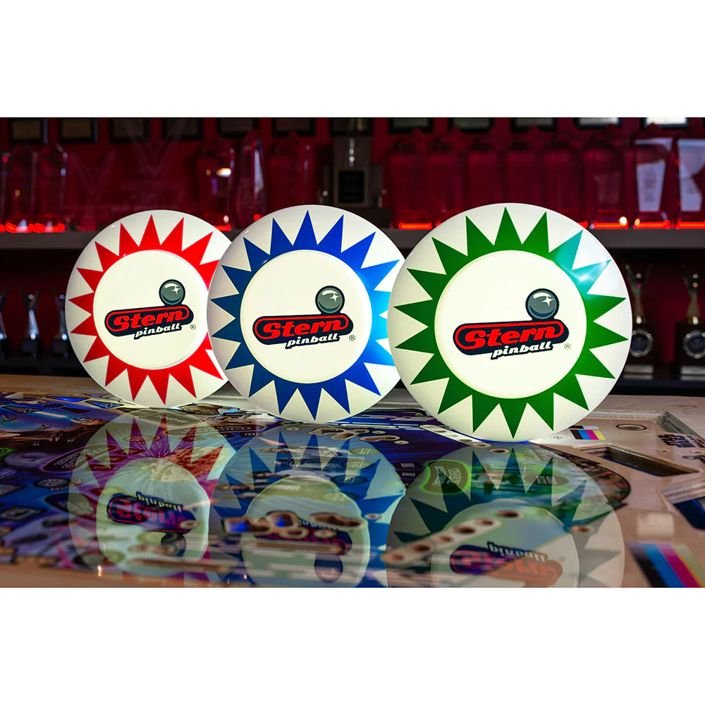 These 3 packs of pop bumpers daisy chain to each other. You can hang them or put them out as lamps. Made exclusively for Stern Pinball.