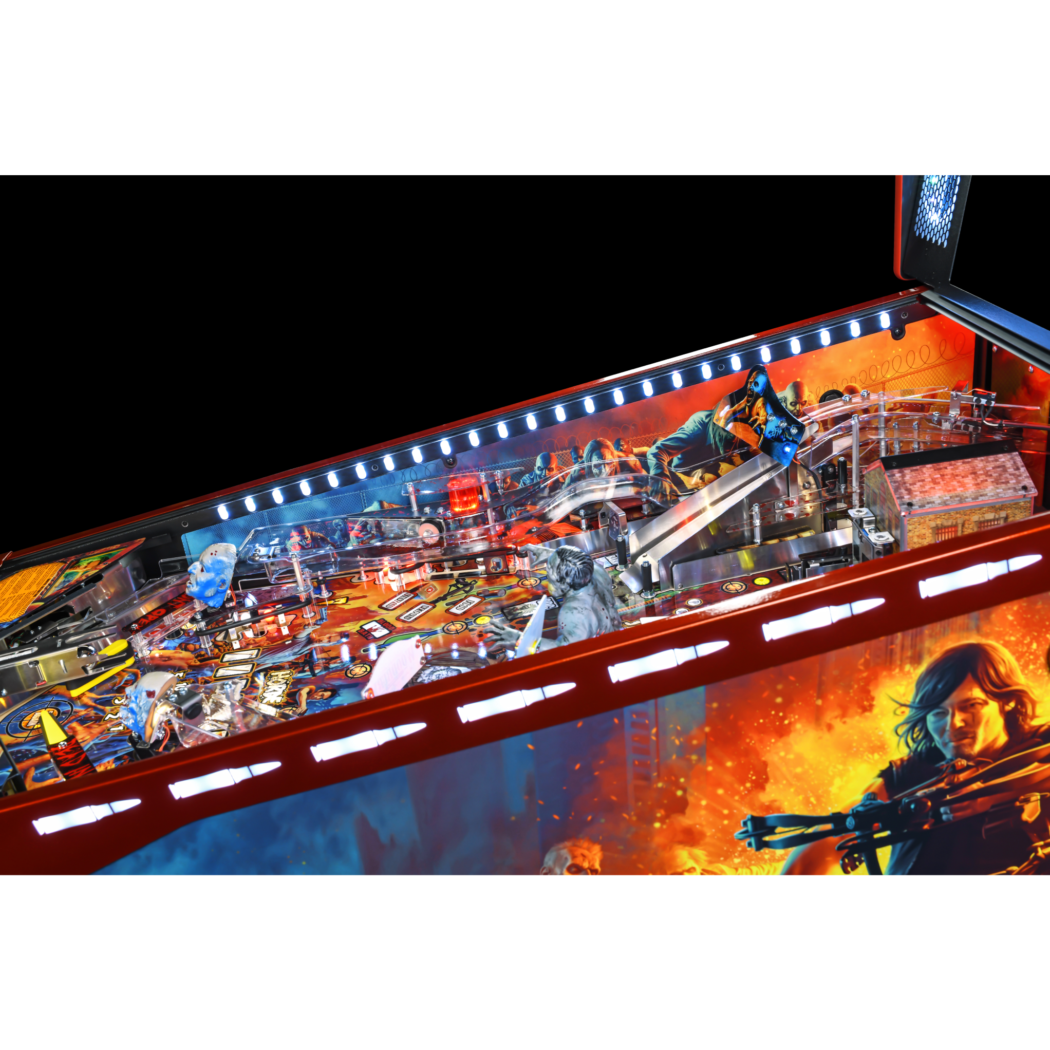 The Walking Dead Remastered features Stern’s next-generation SPIKE 3 technology platform, which includes a larger 18.5” full HD display with true color depth, along with a more powerful processor, and a new high fidelity immersive audio system. Players will get to experience completely overhauled 3D-rendered graphics and custom animations that pay homage to the dot matrix display from the original  pinball machine. SPIKE 3 electronics also feature more efficient power handling, improved Wi-Fi support, and wireless headphone capabilities.  This release will also feature an updated cabinet lighting customization system designed to allow for internal and external expression lighting on all versions of the game.